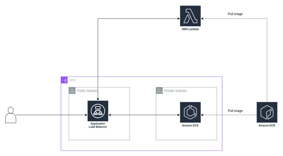 The two backend targets consist of an AWS Lambda function and an ECS Fargate service. Both serve the same FastAPI application via Docker containers. The ECS service runs in private subnets, ensuring it’s not directly accessible from the internet, while the Lambda function runs fully managed in AWS’s serverless environment.