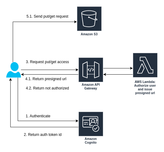 If the user is authorized, the backend generates a presigned URL with PUT or GET permissions for the object and returns it to the client.